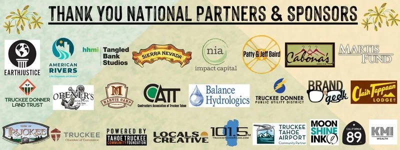 Hosting the Wild & Scenic Film Festival would not be possible without the support of our 2024 Wild and Scenic National Sponsors and MAP Sponsors: Earthjustice, Sierra Nevada Brewing, Tangled Bank Studios, American Rivers, Impact Capital, Patty & Jeff Baird, Cabona’s, Martis Fund, Martis Camp, Obexer’s Boat Company, Truckee Donner Land Trust, Contractors Association of Truckee Tahoe, Balance Hydrologics, Brand Geek, KMI Wealth, Truckee Donner Public Utility District, Locals Creative, Tahoe Truckee Community Foundation, Truckee Chambers, Town of Truckee, Moonshine Ink, 101.5 Truckee Tahoe Radio, Truckee Tahoe Airport District, Clair Tappaan Lodge, and California 89.